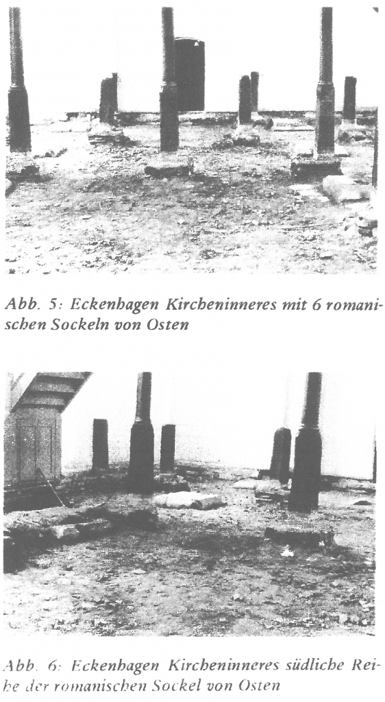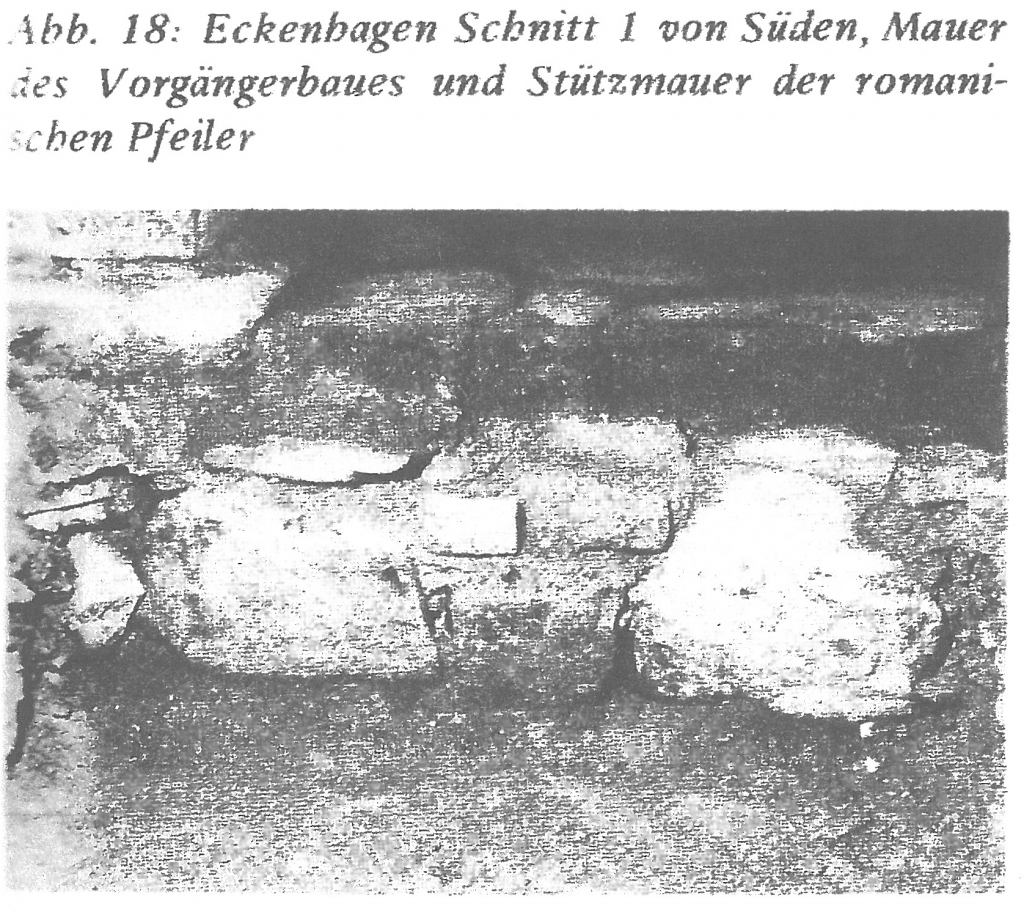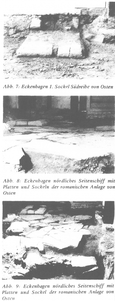 Die westlichen letzten Sockel der romanischen Anlage waren ganz dicht an den Turm herangerückt und in diesen mit Aussparungen eingelassen. Das erwies die zeitliche Zusammengehörigkeit von Turm und Kirchenschiff.