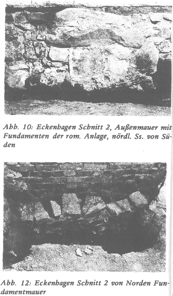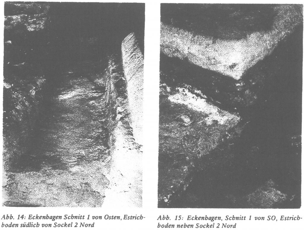 Teile des Estrichbodens kamen auch in diesem Schnitt bei 6,70 bis 7,20 m Süd und 10,00 bis 12,00 m Ost zum Vorschein. Auch wenn diese Teile des Bodens höher als in Schnitt 1 lagen, sind sie dem Vorgängerbau zuzurechnen.