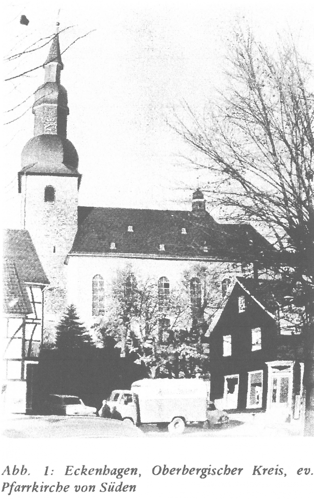 Die nördlichste romanische Anlage, die nach Bauweise und Typus noch dem niederrheinischen Gebiet zuzurechnen ist, ist in der evangelischen Dorfkirche von Meinerzhagen in Westfalen erhalten16. Der Bautypus ist durch die Lage an einer wichtigen Verkehrsverbindung bedingt, die ins Rheinland führt und den starken Einfluß des Rheinlandes bis in dieses Gebiet zeigt17. Auch Eckenhagen liegt an einer derartigen bedeutsamen frühen Verkehrsverbindung, die erst den Abtransport der Blei- und Silbervorkommen aus dem Eckenhagener Raum ermöglichte18.