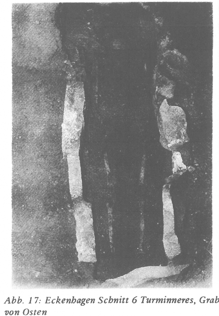 Im Schnitt 6 im Turminneren fand sich in 1,37 m Tiefe unter dem heutigen Niveau bei 1,65 m West und 3,96 m Süd in einer Steinsetzung aus schmalen behauenen Steinplatten eine Bestattung in O-W Ausrichtung, nach Anlage und Tiefe die älteste in der Kirche gefundene. Zum Kopf hin verjüngte sich die Steinsetzung, so daß der Schädel eng eingepaßt zwischen den Steinen lag. Auffällig war die Länge des Bestatteten, die über 1,80 m betrug (Abb. 17).